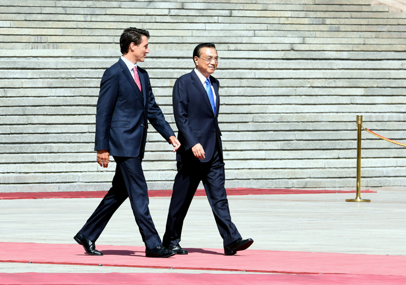 李克强昨天已经与特鲁多会面,他表示,中加关系源远流长,两国友好深入人心。建交46年来,中加政治、经贸、人文等关系不断深化,各领域合作成果切实惠及两国人民。中国已成为加拿大第二大贸易伙伴、第二大进口来源地和第二大出口市场,两国关系与合作发展前景广阔。