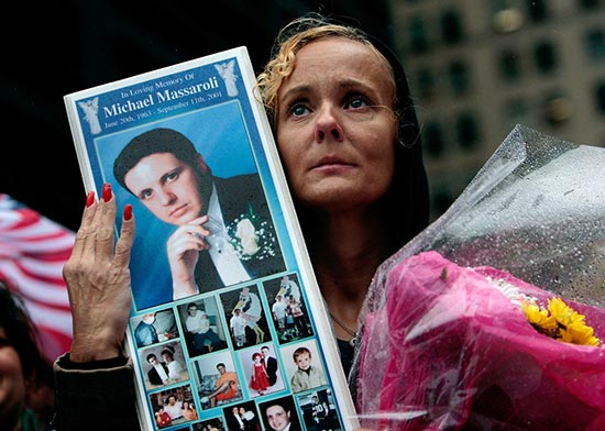 2009年,“9.11”遗属马萨罗利高举已故丈夫的照片/美联社