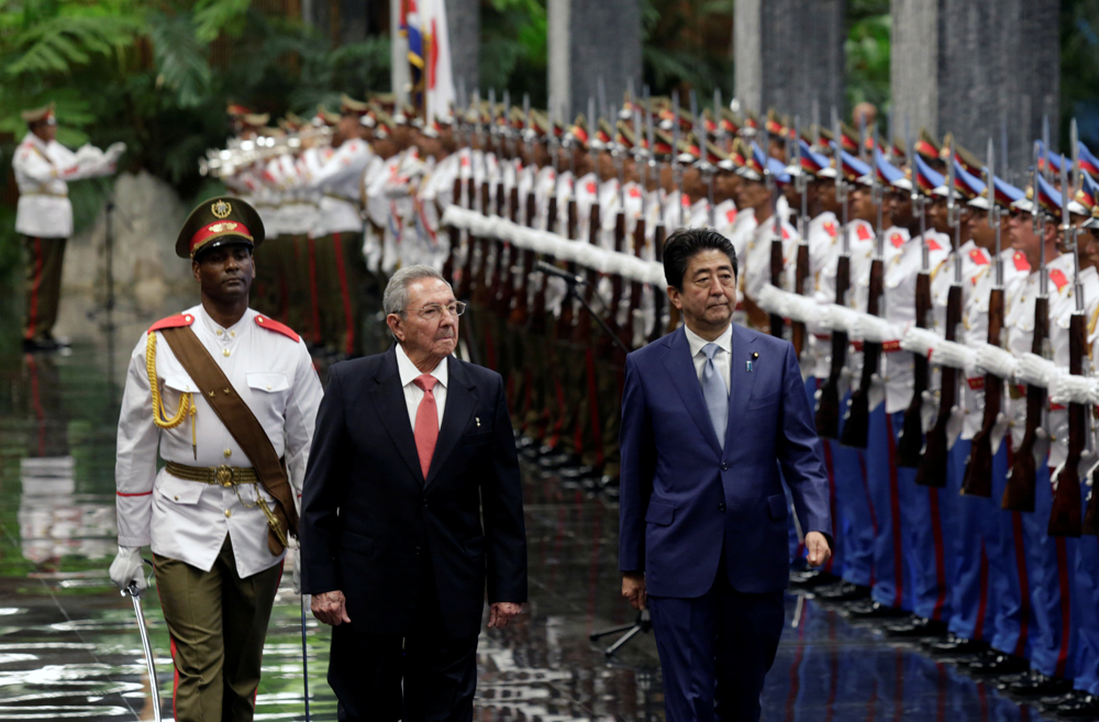 日本首相安倍晋三22日在古巴领导人劳尔•卡斯特罗(中)陪同下检阅仪仗队。路透社