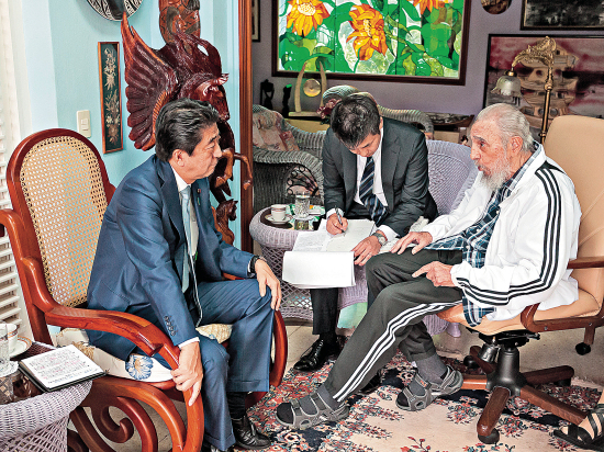 古巴前领导人菲尔德•卡斯特罗(右)22日在私人住宅会晤安倍晋三。路透社