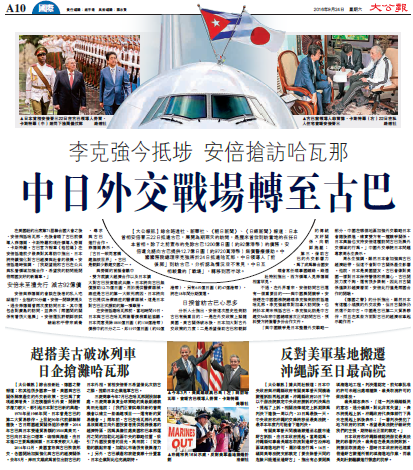 大公网9月24日讯 综合路透社、新华社、《朝日新闻》、《日经新闻》、德国之声报道,日本首相安倍晋三22日抵达古巴,展开为期两天的访问,是历来首位到访当地的在任日本首相。除了之前宣布的免除古巴1200亿日圆(约92亿港币)的债务,安倍还允诺向古巴提供12.7亿日圆(约9720万港币)无偿医疗援助。中国国务院总理李克强将于24日抵达哈瓦那,中日领导人“前后脚”到访古巴,分析认为情况并不常见,中日互相较量的“战场”,转移到西半球。