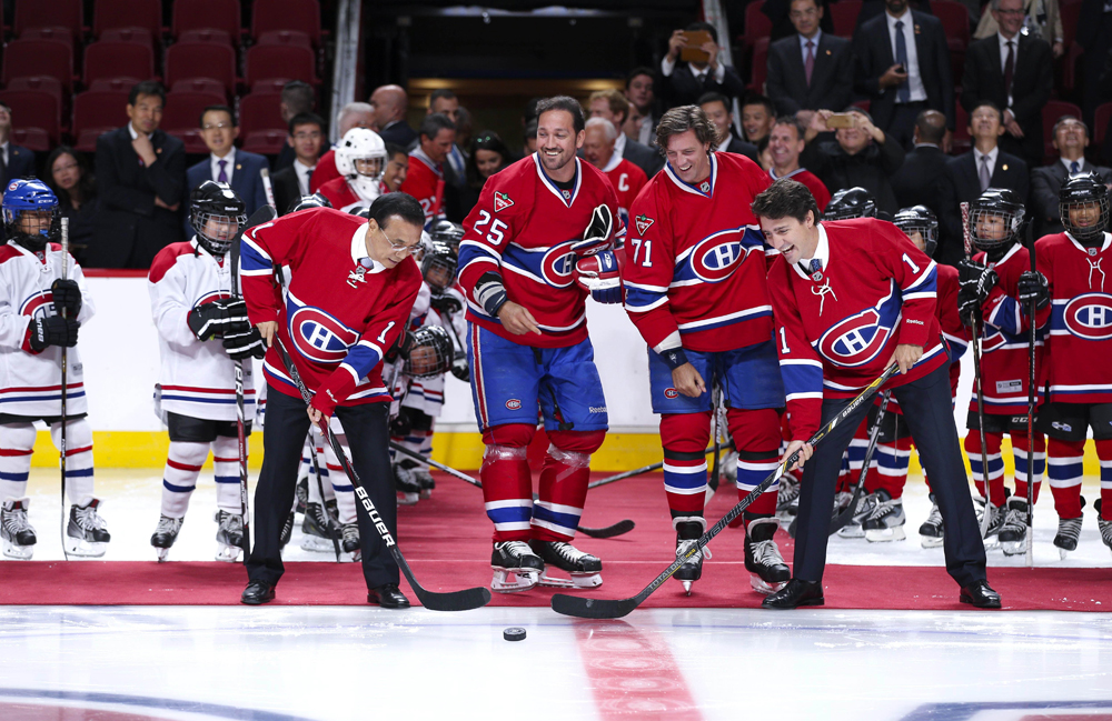 图:23日,李克强在加拿大总理特鲁多陪同下参观当地“加拿大人”冰球队,获赠印有他名字的球衣。李克强穿上球衣,与特鲁多一起为参加训练的小球员开球\中新社