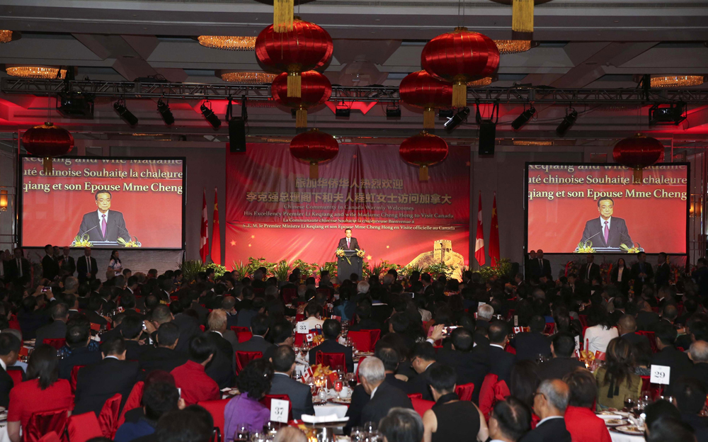 图:23日晚,李克强和夫人程虹出席加拿大华人华侨举行的欢迎宴会,李克强在宴会上致辞\中新社