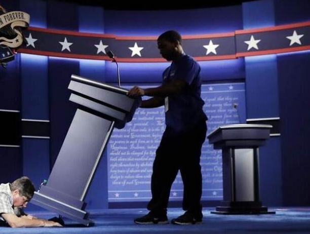 霍夫斯特拉大学布置美国大选第一场候选人辩论的会场。