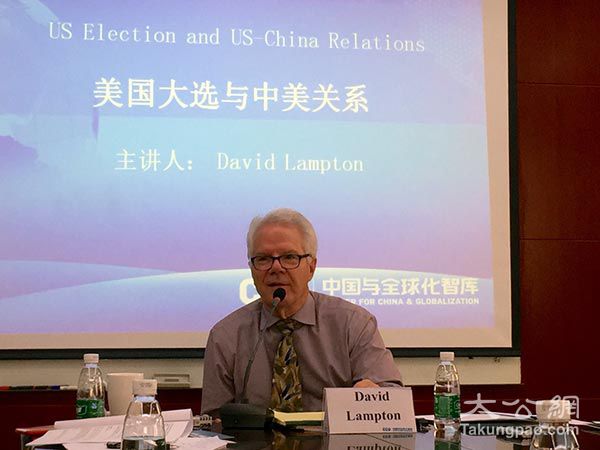 大公网9月27日讯(记者严雪)距2016美国大选只剩不到50天时间,共和党候选人唐纳德•特朗普、民主党候选人希拉里•克林顿的选战已经进入白热化的倒计时阶段,并完成了第一场竞选电视辩论。两位候选人各自优势劣势如何?在中国的南海主权、台湾问题等方面持怎样的立场?大公网记者近日对话美国知名“中国通”大卫·蓝普顿(David Lampton),他预测,希拉里将会赢得大选。同时他提醒说,中国应当多多关注总统大选带来的国会结构的改变,视美各州为“天然盟友”,因为这也将给美国政治及中美关系带来变数。