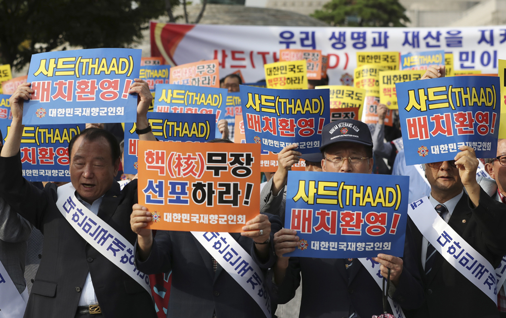图:韩国老兵组织9月30日在首尔示威,反对部署“萨德”\美联社