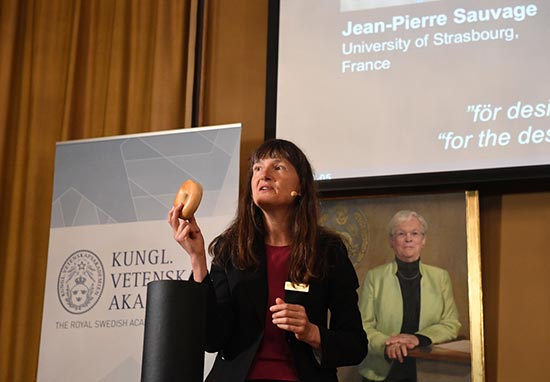 图:诺贝尔化学委员会主席琳斯5日在记者面前用面包来解释“分子机器”概念\法新社