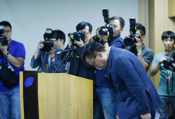图:三星移动部门主管高东镇9月2日就“爆炸门”向顾客道歉/法新社