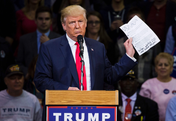 图:特朗普10日在宾夕法尼亚州演说时挥舞手稿/法新社