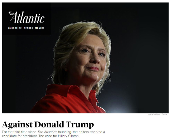 另一方面,《大西洋月刊》创刊100多年,仅在1860年宣布支持解放黑奴的林肯总统,以及1964年支持民主党总统林登.约翰逊,反对保守派的参议员高华德(BarryGoldwater)。《大西洋月刊》认为2016的情况,与半世纪前的约翰逊对决高华德类似。《大西洋月刊》强调,特朗普大概是227年的美国总统选举史上,最招摇却不符资格的主要政党候选人。