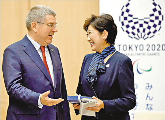 IOC主席巴赫(左)与东京都知事小池百合子会面/法新社