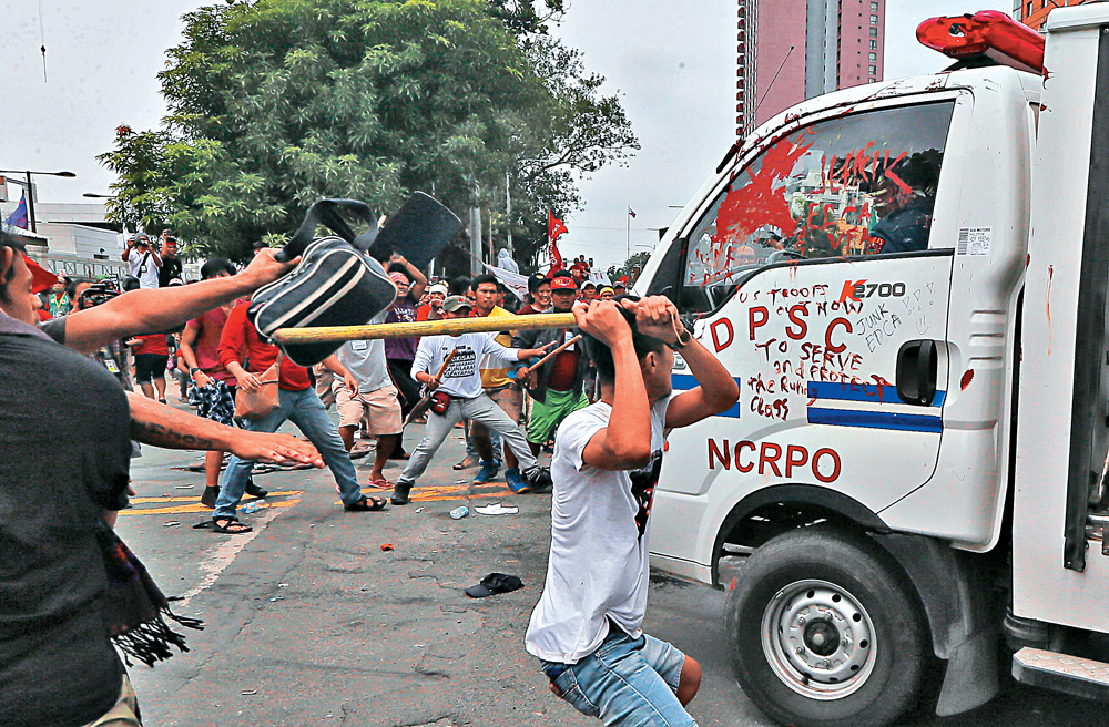 包括学生、劳工和土着居民在内的上千名抗议者,19日在美国大使馆外高举“美军滚蛋”等标语,要求美军撤离菲律宾,以支持总统杜特尔特近期反美主张。示威者情绪激动,不断尝试冲破警方的防线和冲入大使馆的大门,警方则对不断逼近使馆的民众动用警棍、水柱与催泪瓦斯示威者。示威者在成功冲破警方防线后,向大使馆外的墙壁以及警察淋泼红油。 正当示威领袖高喊示威者冷静之际,一辆警车突然急速倒退,后方示威人群纷纷走避。现场影片显示,一辆警车在遭到群情激愤的民众敲打后突然开始倒车约20米,然后两度加速冲向群众。许多人就像保龄球瓶一样被撞倒,现场不断传出惨叫。在片段中,一名满头白发的男子,下半身几乎全在警车下方,一条腿全压在黑色的轮胎下面。