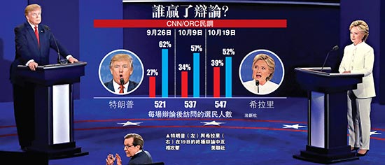 大公网10月21日讯(驻纽约记者黄晓敏)美东时间19日晚9时,美国总统候选人举行第三轮,也是投票前的最后一场辩论。当晚,民主党候选人希拉里与共和党候选人特朗普在赌城拉斯维加斯的内华达大学再次正面交锋,特朗普在辩论中两度拒绝承诺将接受大选结果,引发舆论关注,分析指特朗普或为选战埋下苦果,也为美国政治埋下暗雷。