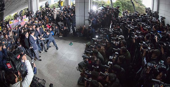 图:崔顺实在检方人员的陪同下进入地方检察院,现场聚集大批记者/法新社