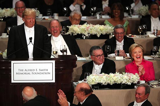 图:特朗普(左)讲笑话,希拉里(右)出席一场慈善晚宴\法新社