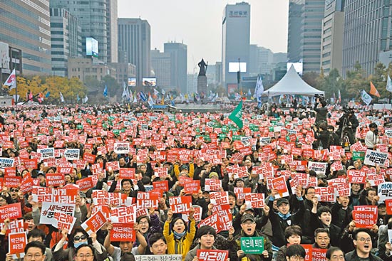 大公网11月6日讯 综合韩联社、法新社、韩国《朝鲜日报》网站报道:韩国民众及多个市民团体五日在首尔举行大规模集会,抗议“闺密门”干政事件,要求总统朴槿惠负责。主办方指今次集会有近20万名民众参加,成为自2008年反对美国牛肉进口以来,韩国人数最多的示威之一。