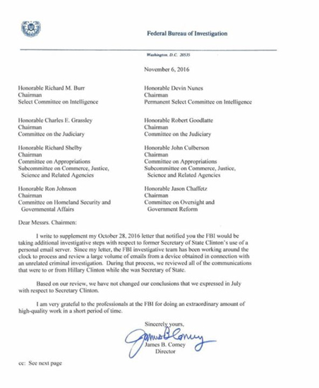 大公网11月7日讯(驻纽约记者 黄晓敏) 美国联邦调查局(FBI)局长科米6日写信给国会称,经过FBI调查员夜以继日的审查后,他没有改变他在今年7月得出的结论,那就是,希拉里·克林顿在担任国务卿期间使用私人服务器处理电邮,并没有犯罪。