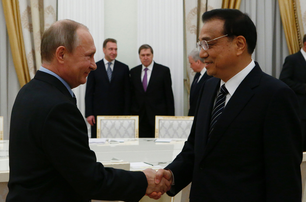 图:8日,中国国务院总理李克强在莫斯科与俄罗斯总统普京会面时握手致意\法新社