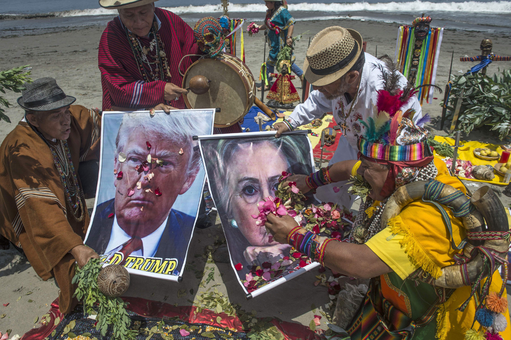 利马海滩上,秘鲁人将希拉里和特朗普的照片印成海报做宗教仪式\法新社
