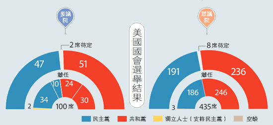 11月8日美国大选,除了会选出新总统外,国会亦会于同日选举中选出一批新血。参议院100席中,34席举行改选。原本占54席的共和党已经保住大部分议席,取得掌控权。而众议院方面,435席全部改选,民主党人虽有进帐,但数目不大,目前以191比236席落后于共和党,由于仅有八席仍未有结果,共和党取胜的大局已定。