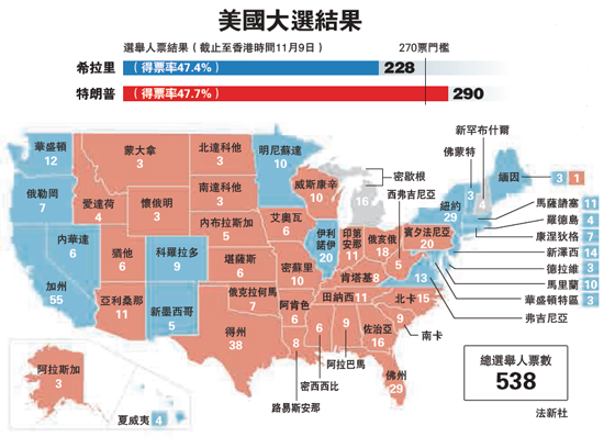 截至本港时间10日凌晨,全美还有两个州份没有完成点票,他们是密歇根州跟新罕布什尔州,但在已经开票的州份中,特朗普势如破竹,拿下290张选举人票,远远超过入主白宫的门槛270张,而希拉里只获得228张。