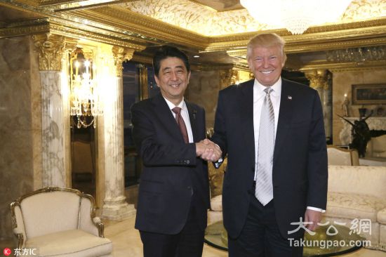 大公网11月19日讯 综合彭博社、路透社及英国《金融时报》报道:日本首相安倍晋三周四终于见到美国当选总统特朗普,其间安倍效仿外公岸信介的“高尔夫球外交”,极力献媚选前被他看低的特朗普,向对方赠送发球杆,后者则回赠他球服。日方指,双方在“热烈气氛”下,坦率地讨论相关议题,但具体内容欠奉。安倍会面后告诉记者,对特朗普有“十足信心”。