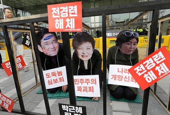 大公网11月19日讯 据韩联社报道:虽然在野党步步逼近、民众接连示威,要求卷入“闺密门”的韩国总统朴槿惠下台,但青瓦台依然企硬,坚称朴槿惠不会下台。青瓦台发言人18日表示,待中日韩三国峰会会议日程敲定后,朴槿惠将出席会议。