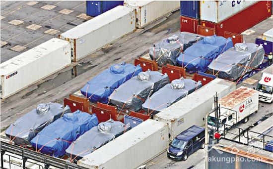 据悉,当中有九个货柜共装有九辆新加坡制AV-81泰瑞克斯(Terrex)八轮装甲车,另外三个货柜则为军需物品。