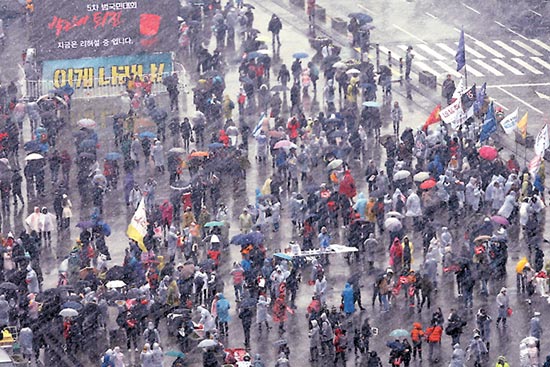 首尔民众无惧风雨,出席集会人数再创新高。路透社