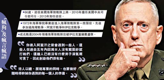 特朗普在辛辛那提举行的集会上,对支持群众说:“我们将任命‘疯狗’马蒂斯出任我们的国防部长。他是我们最好的人选,有人说他是所有人选中最像(二战时代)巴顿将军的人。”特朗普上月胜选后就见过马蒂斯,当时就大赞对方是“将军中的将军”。