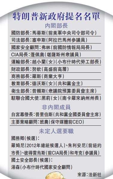 马蒂斯掌管五角大楼,再次说明了特朗普在组建国家安全团队时,对前军方人士的依赖,亦显示特朗普有意让美国外交政策脱离奥巴马政府的基调。特朗普选择了退役的陆军中将弗林为国家安全顾问,并且正在考虑提名海军上将罗杰斯担任国家情报总监。他还考虑让另一位退役的海军陆战队司令凯利,出任国土安全部部长。这些人几乎清一色的严厉批评奥巴马政策的人物。