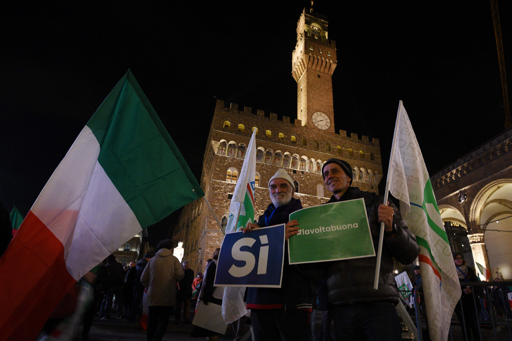 图:伦齐的支持者2日在佛罗伦斯领主广场上集会\法新社
