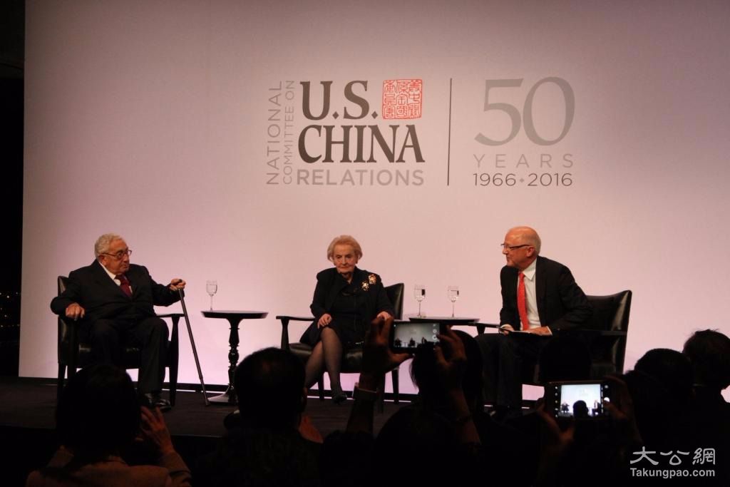 美中关系全国委员会5日晚邀请前国务卿基辛格和奥尔布莱特同台讨论美中关系,由会长欧伦斯主持。当被问到对特朗普与台湾的蔡英文通电话的看法时,基辛格表示,“此时此刻,我对中国领导人对此事的冷静反应印象深刻,这显示一种看看能否将一个平静的对话继续下去的决心。”