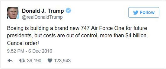 图:特朗普在推特上炮轰波音的“空军一号”造价太贵\网上图片
