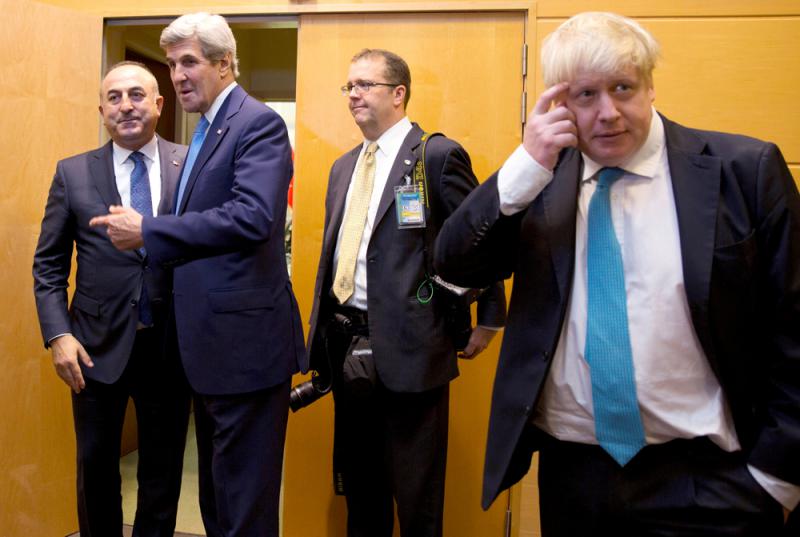 图:英国外交大臣约翰逊(右)6日在布鲁塞尔出席北约外长会\路透社