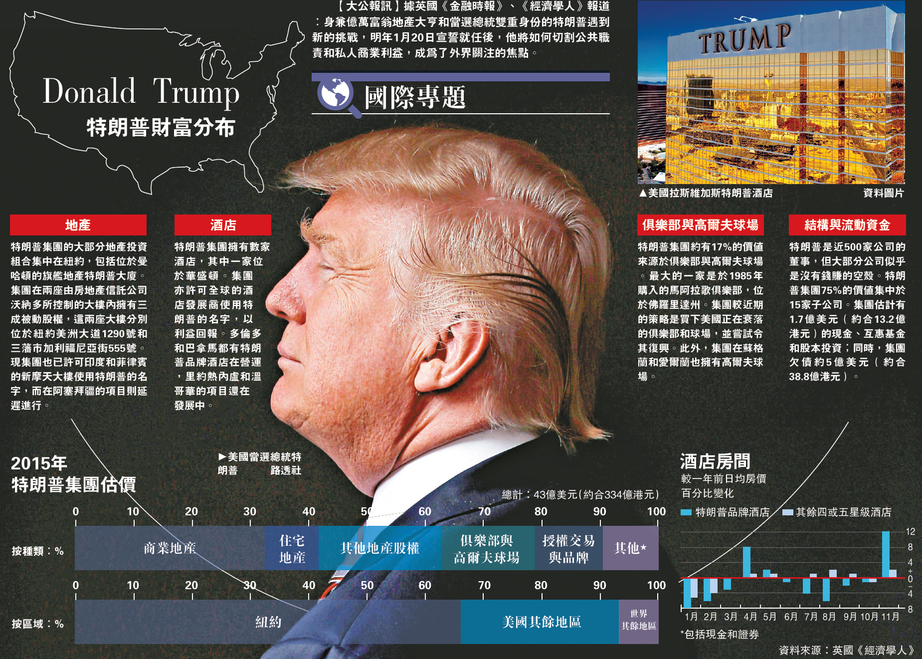 大公网12月12日讯 据英国《金融时报》、《经济学人》报道:身兼亿万富翁地产大亨和当选总统双重身份的特朗普遇到新的挑战,明年1月20日宣誓就任后,他将如何切割公共职责和私人商业利益,成为了外界关注的焦点。