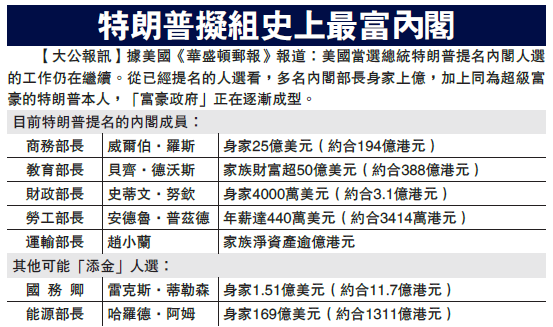 特朗普集团的估值大约43亿美元(约合334亿港元),当中约八成在由特朗普集团拥有的住宅和商业地产,年收入4.9亿美元(约合38亿港元)。如果上市,它会是美国市值排名第833位、销售额排名第1925位的公司。特朗普总爱吹嘘自己富可敌国,也常常夸耀他的富豪朋友是人生赢家,比职业政客更有能力治国。但据特朗普竞选时披露的信息判断,他控制的集团只是一个时间并不悠久,主营国内地产业务的小企业,在全美1000强公司中垫底,远称不上是全球性的巨头。不少曾担任或竞选过高级公职的富豪─包括尼尔森·洛克菲勒、米特·罗姆尼和迈克尔·彭博─都拥有和经营过更强大的公司。