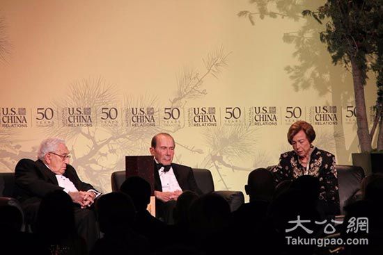 大公网12月16日讯(驻纽约记者黄晓敏) 美中关系全国委员会12月15日在纽约举行成立五十周年庆祝晚宴。中国国家主席习近平和美国总统奥巴马分别向委员会发来贺信。前美国国务卿基辛格和美国国际集团前总裁莫里斯?格林伯格被委员会授予终生成就奖,这是该委员会成立以来首次颁发此类奖项。