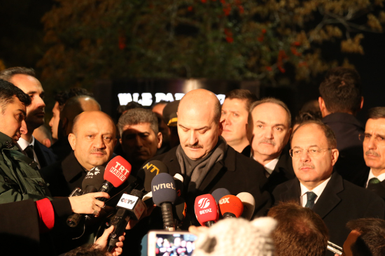 土耳其内政部长苏莱曼·索伊卢(中)在收治枪击受伤者的医院外召开临时新闻发布会(新华社)