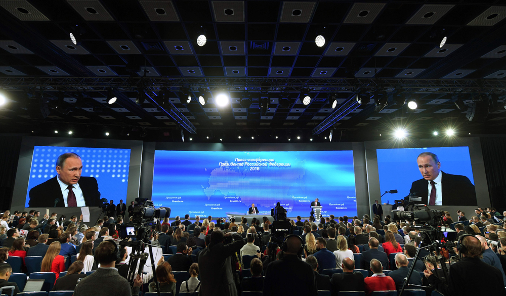 图:俄罗斯总统普京的年度记者会现场/法新社