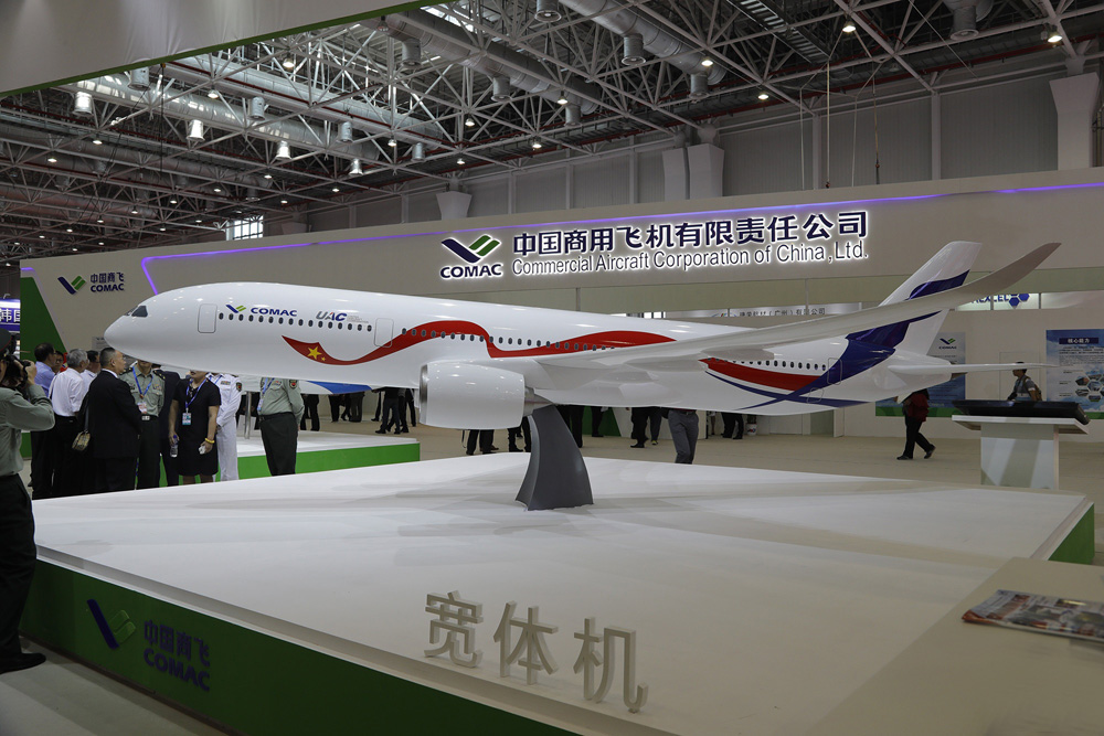 图:今年珠海航展上展出印有中国及俄罗斯两国公司标志的飞机模型 资料图片