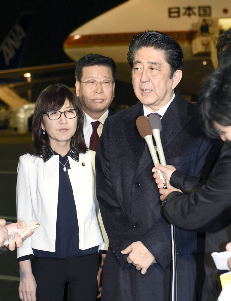图:日本首相安倍晋三(右)26日在羽田国际机场接受访问 美联社
