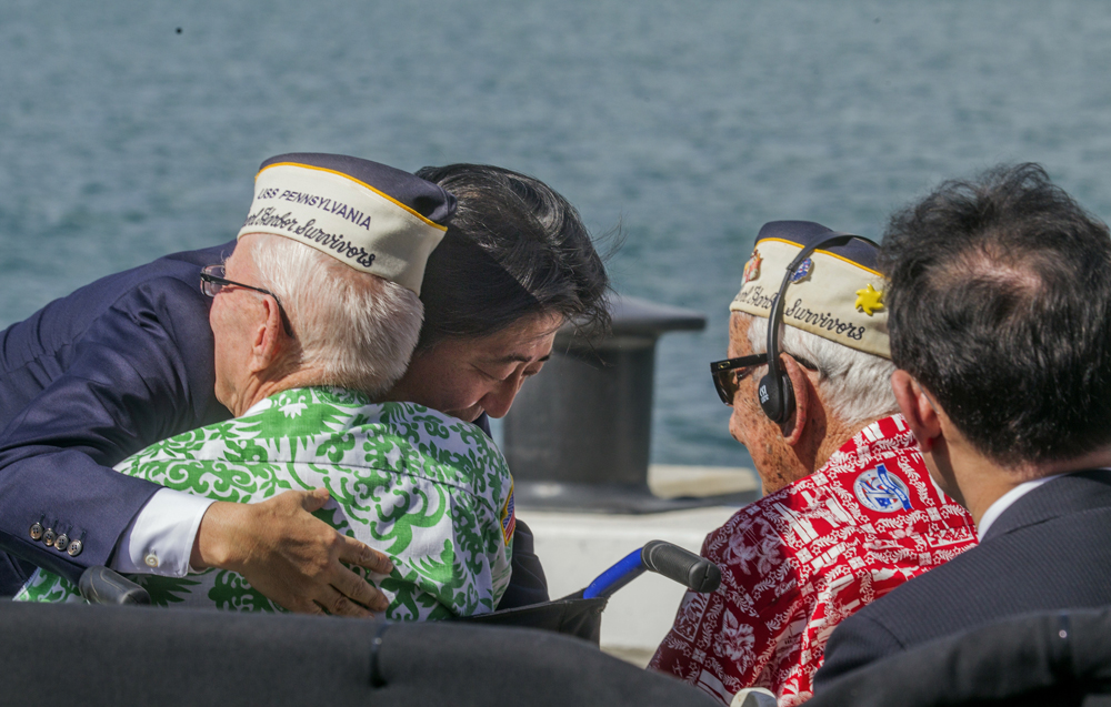 图:安倍晋三拥抱一名珍珠港战役幸存美国老兵 美联社