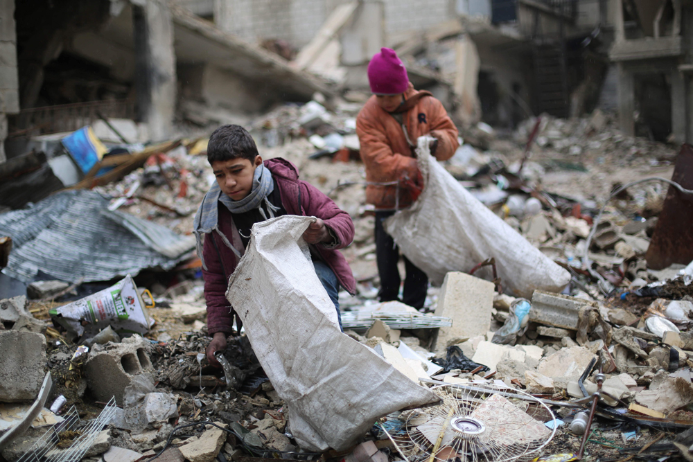 图:叙利亚儿童在废墟里搜寻食物 法新社