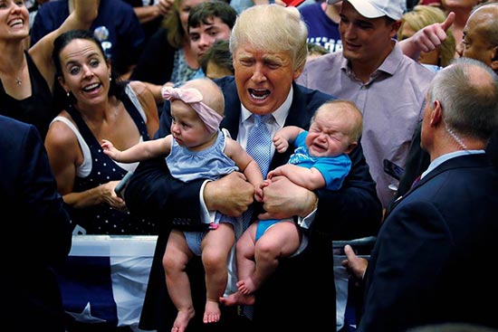 图:共和党总统候选人特朗普(中)在拉票活动上抱着两名婴儿\网上图片