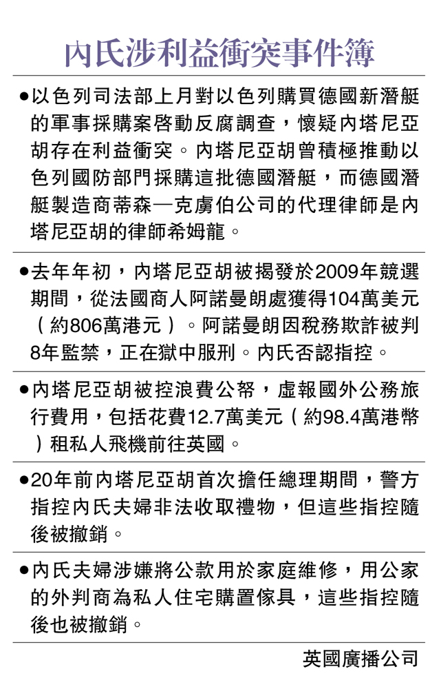 此外,内塔尼亚胡向一间德国公司购买潜艇时,被控涉利益冲突。当时内塔尼亚胡家族律师希姆龙所扮演角色涉及利益冲突,因希姆龙也是德国潜艇製造商蒂森─克虏伯集团在以色列的代理律师。