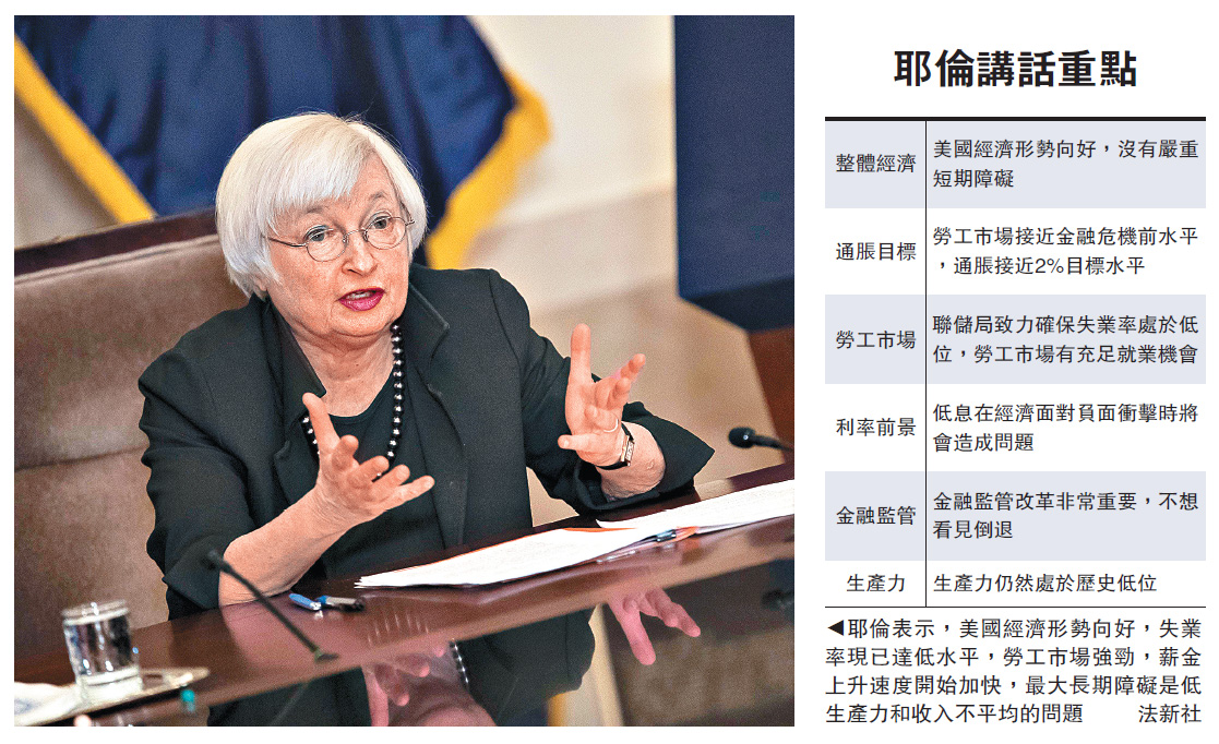 图:耶伦表示,美国经济形势向好,失业率现已达低水平,劳工市场强劲,薪金上升速度开始加快,最大长期障碍是低生产力和收入不平均的问题/法新社