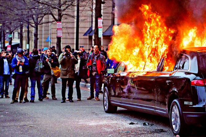 夜幕降临后,有人点燃街边的汽车泄愤,其中包括一辆黑色高级轿车和一辆电视转播卡车。有示威者还将垃圾桶拖曳到通往白宫的街道上进行燃烧,并且将印有“让美国再次伟大”字样的帽子投掷到火堆里焚烧。街边又烟又火,垃圾遍地,惊吓到了不少准备参加就职晚宴、打扮得体的特朗普支持者。最终,当日的暴力冲突导致六名警察受伤,逾200多人被捕。