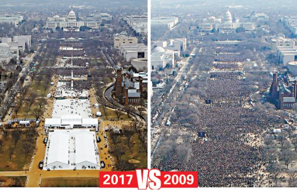 CNN网站比对今年与2009年奥巴马首次就职的现场照片,国家纪念公园上的群众规模大幅缩小,许多区块完全空无一人,跟八年前几乎被群众挤得水泄不通的情况差异极大。