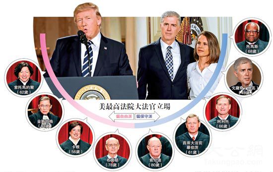 大公网2月2日讯 综合英国广播公司及美国《纽约时报》报道:美国总统特朗普周二宣布,提名保守派联邦上诉庭法官戈萨奇为最高法院大法官,填补去年2月突然逝世的保守派大法官斯卡利亚遗下的空缺。若这项提名获得参议院通过,高院内9名大法官将有5名属于保守派,将来在堕胎、枪械管制、死刑及宗教权利等争议性议题上,可能作出倾向保守的裁决。